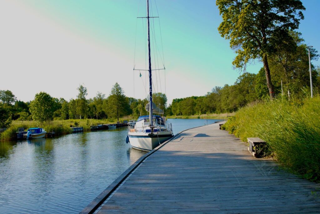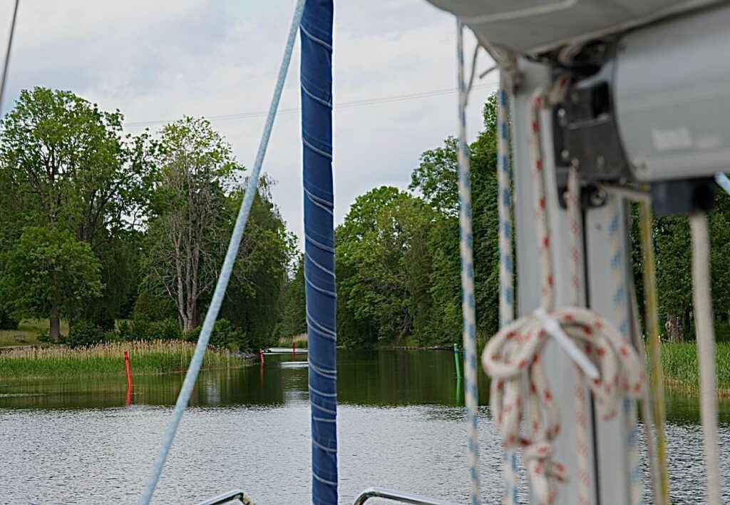 Der nächste Tag sah wettertechnisch nicht besser aus. Aber die Salida musste nicht die Küste gen Norden stampfen, sondern es ging durch den Väddö-Kanal. Zwei Brückenöffnungen waren nötig. Nach der zweiten Brücke bin ich nach 3 sm umgekehrt, zu dolle war der Gegenwind. Hinter der letzten Brücke gab es – quasi als kleine Entschädigung – eine gratis Liegeplatzstelle. Ich lechzte (nach drei Nächten Ankern) auf einen Landgang zum Supermarkt. Nach drei Tagen kam endlich wieder was Warmes in den Bauch 😋 (Fischbuletten mit Kartoffelbrei).