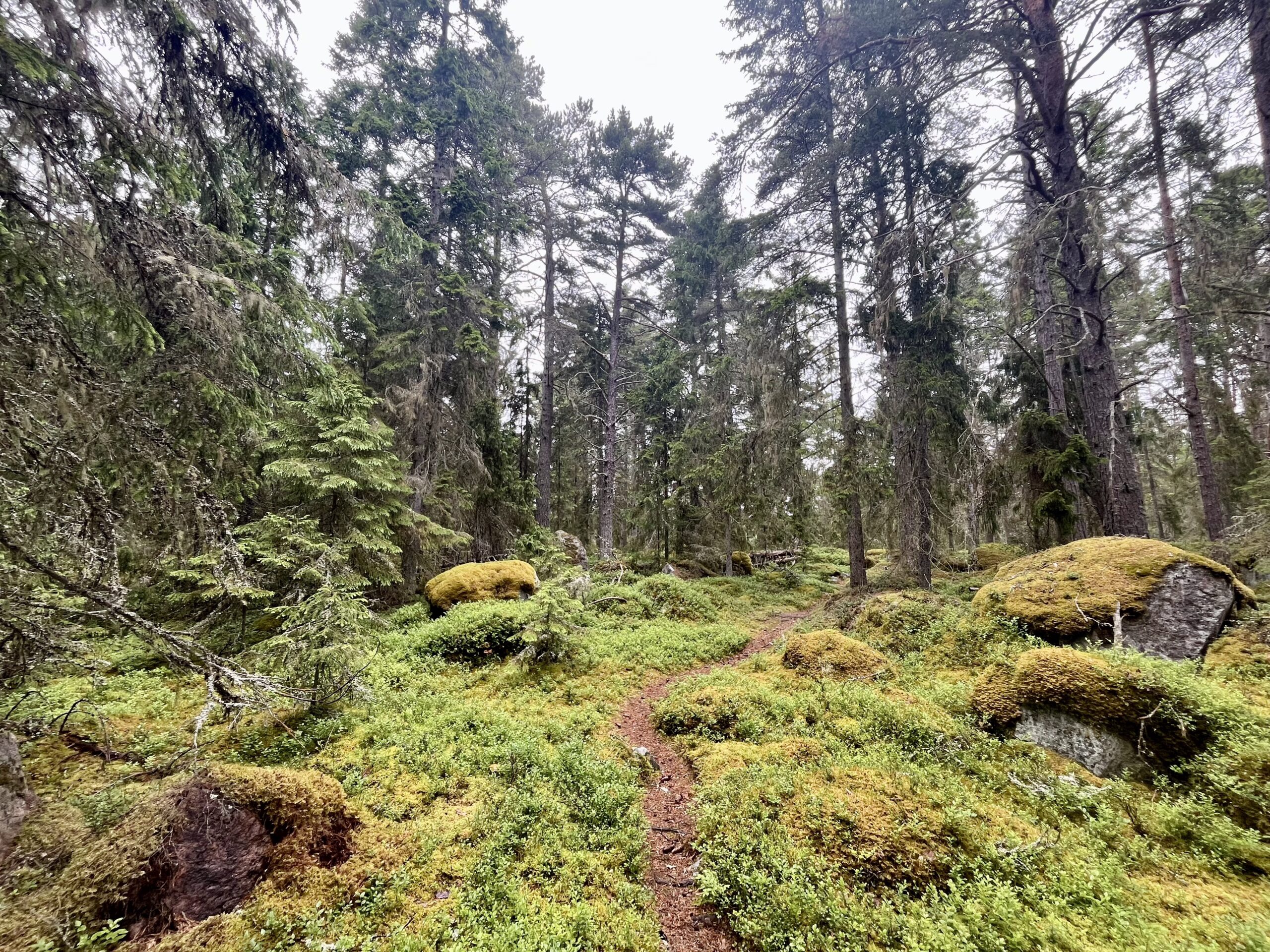 Wir hatten Glück und der angekündigte Dauerregen entpuppte sich als leichte Nieselschauer, sodass wir den urwaldähnichen Inselwald kreuz und quer trockenen Hauptes durchforsten konnten – leider nicht trockenen Fußes. Oft war der Weg nicht mehr als ein vage erkennbarer Trampelpfad durchs sattgrüne und leider triefnasses Blaubeerdickicht 😬.