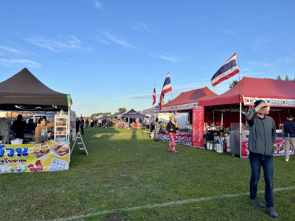 Auf einem Festplatz hinter dem Hafen feiert die thailändische Community ein Fest mit vielen Fress-Ständen und Livemusik. Die hört man allerdings bis ins Boot …
