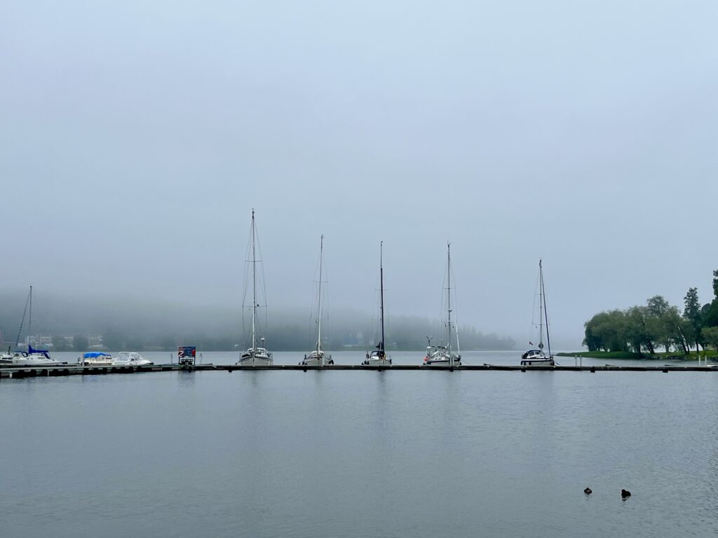 Geplant war ursprünglich, die kürzere Strecke mitten durch die Stadt nach Norden zu nehmen, die unter zwei Brücken hindurchführt, die eigentlich dreimal am Tag nach Anruf geöffnet werden sollen. Aber bereits gestern Abend beim ersten Spaziergang mussten wir feststellen, dass Brücke Nr. 2 eine Baustelle und komplett gesperrt ist. Sogar schon seit zwei Jahren, wie wir später von finnischen Seglern erfuhren. Wieso steht das nirgendwo? Weder an der ersten Brücke noch im Internet findet sich irgendwo ein Hinweis auf die Brückensperrung. Wer erst vor Ort davon überrascht wird, hat dann ungeplante drei Stunden Fahrt außen herum vor sich, sehr ärgerlich. Aber machen wir dann eben. Wir sind auch nicht die einzigen, denen es so geht – die Zahl der Segelboote im Südhafen hat sich seit gestern Abend verdoppelt.