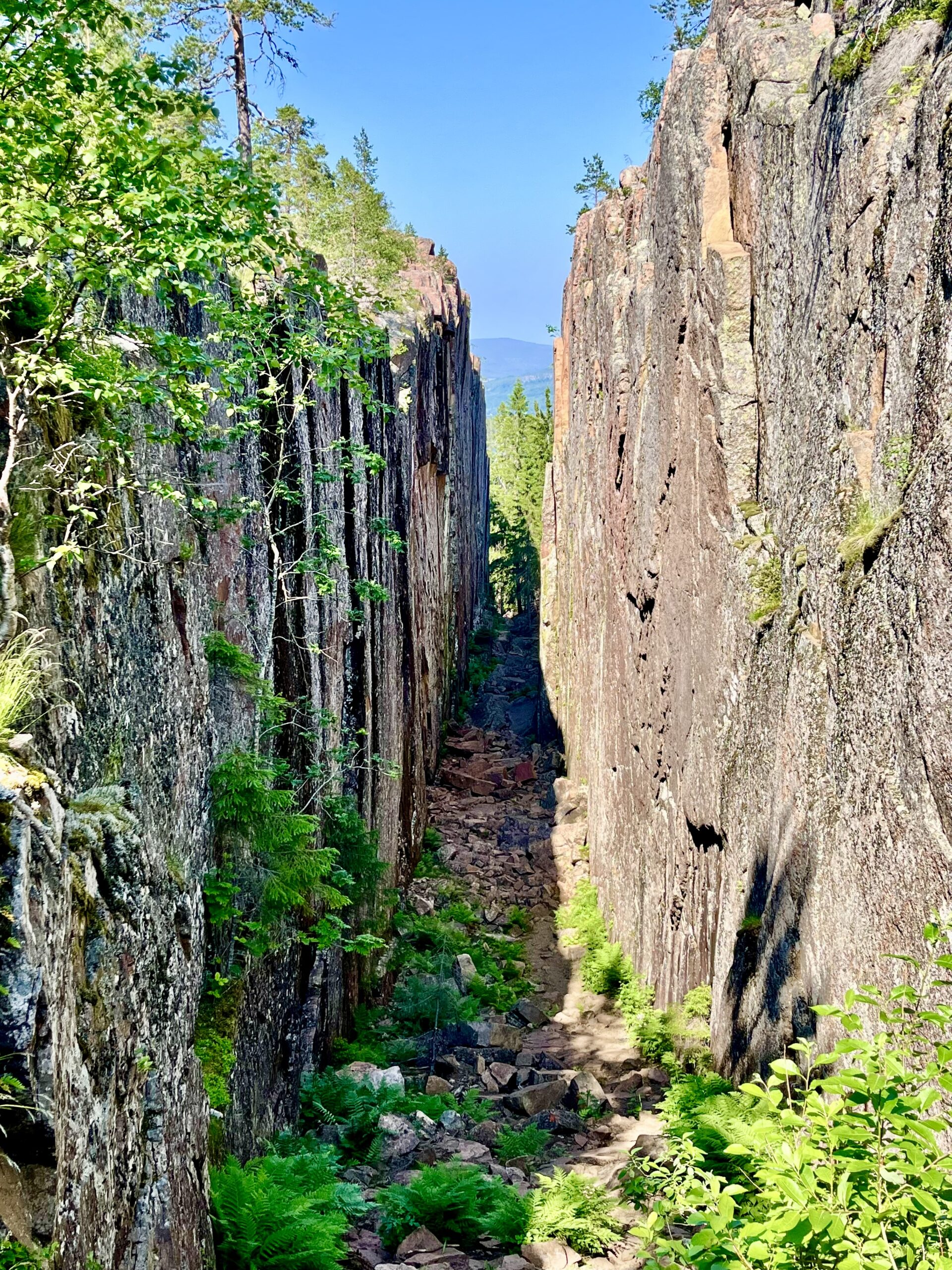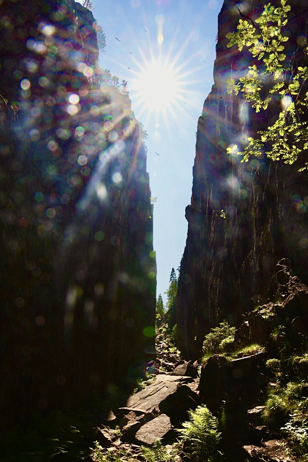 An der Schlucht Slåttdalsskrevan, die den Slåttdalsberget in zwei Teile teilt und die wir uns ein bisschen spektakulärer vorgestellt hatten, trafen wir ein anderes deutsches Seglerpaar, mit dem wir gleich unsere Erfahrungen austauschten. Es wurde übrigens viel deutsch gesprochen, auf dem Parkplatz sah ich auch etliche Womos mit deutschen Kennzeichen.