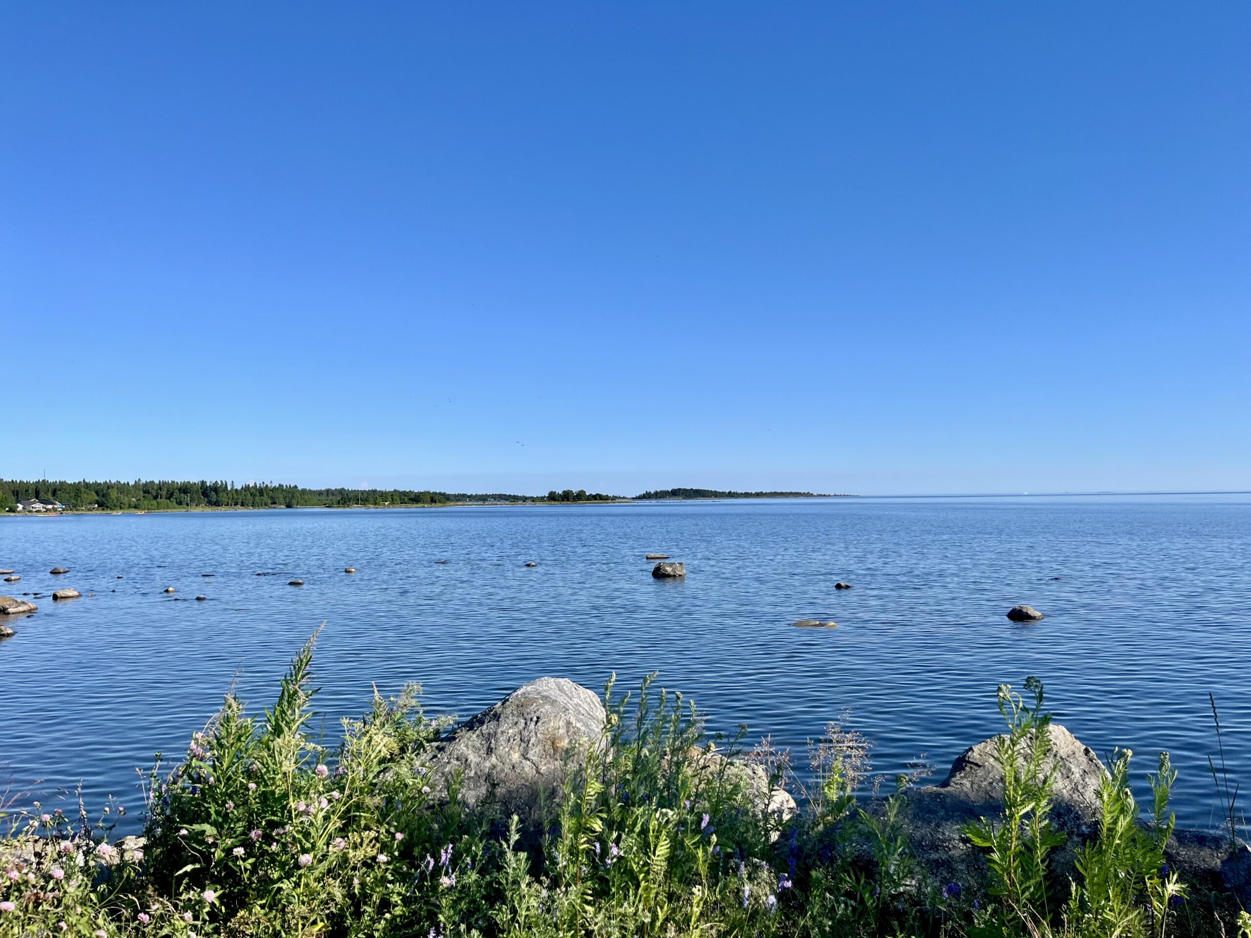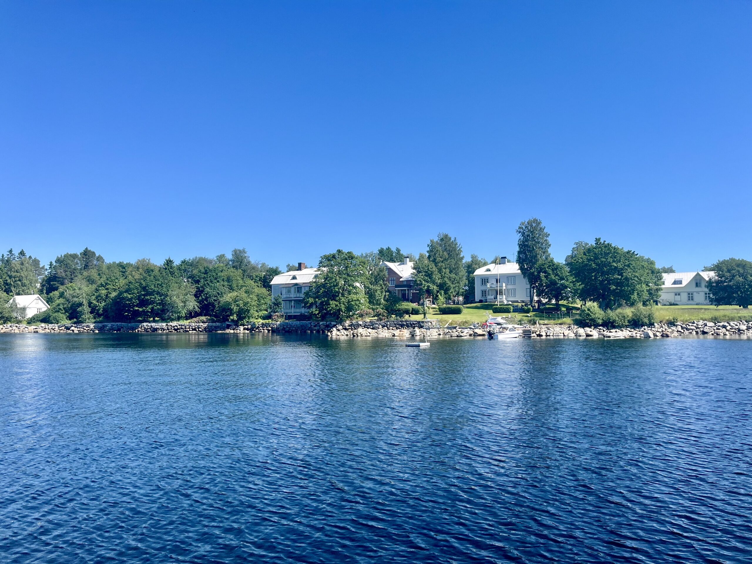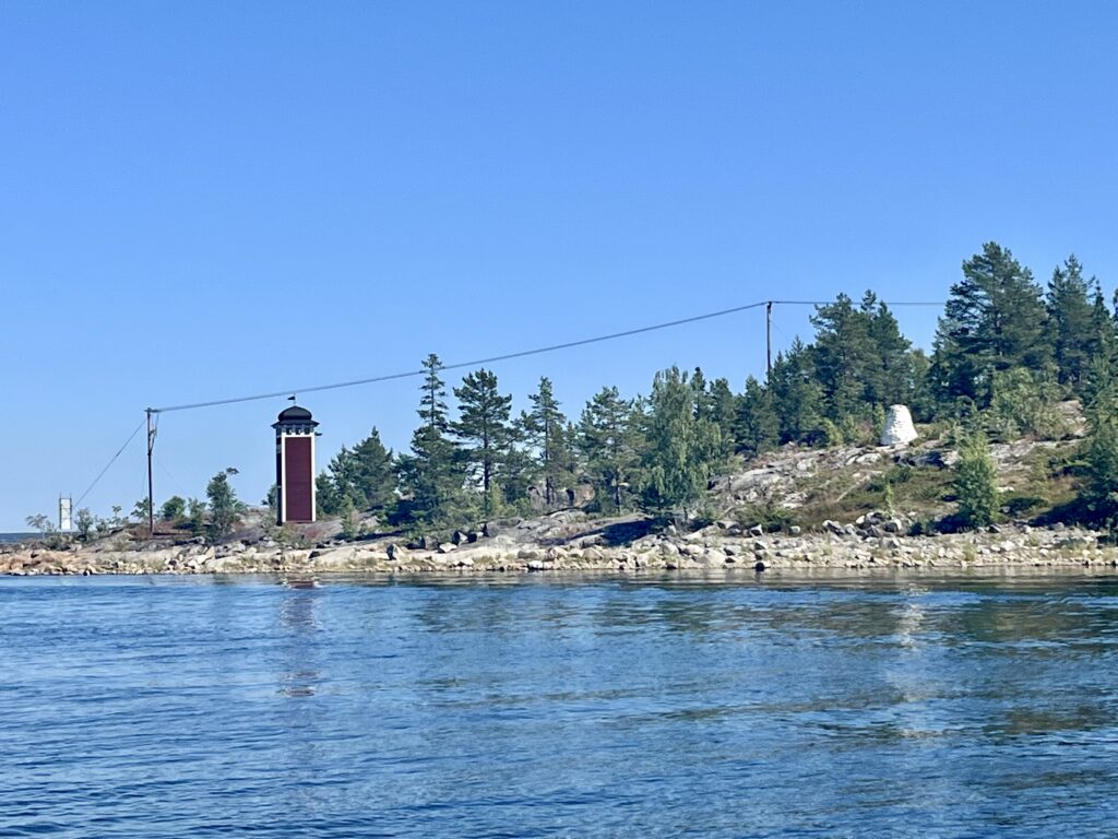 Wir fuhren nicht die direkte Strecke, sondern einen kleinen Umweg über Norrbyskär, das ehemals größte Sägewerk Europas, das sich über drei Schären erstreckt und heute Museum und Sommerfrische zugleich ist. Allzuviel konnten wir vom Boot aus nicht sehen, aber die Fahrt durch die Schären war sehr schön und abwechslungsreich. Die Ostsee wirkt hier oben im Vergleich zu den letzten Tagen wie ein großer Binnensee, wenn das Boot nicht durchgeschüttelt wird. Immer öfter gucken große Steine aus dem Wasser.