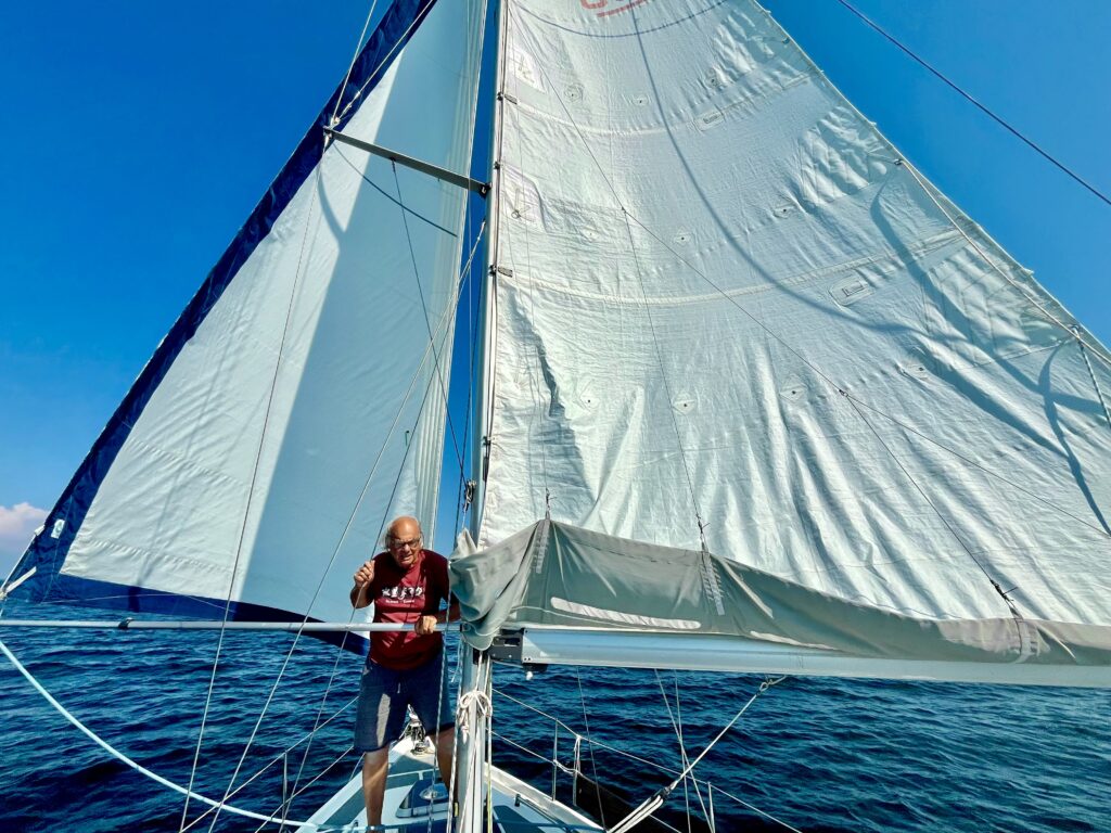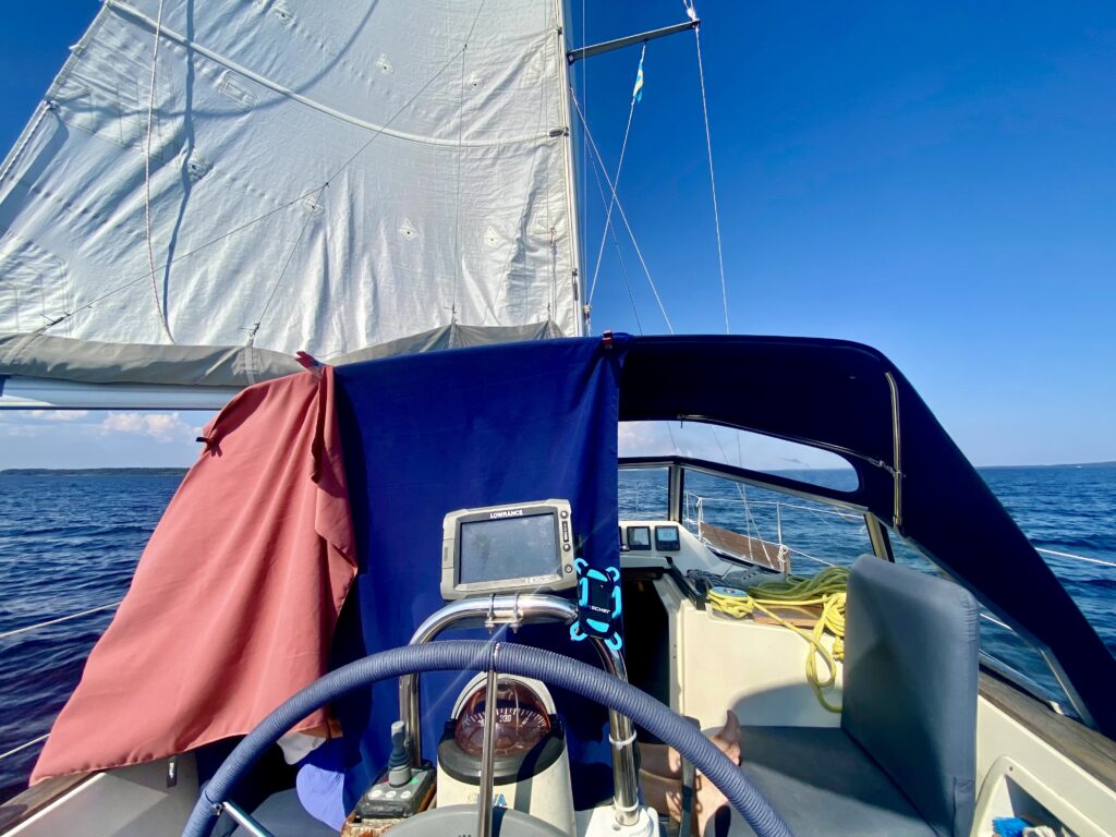Noch ein Stück weiter begann die Einsamkeit der Schärenwelt. Wir hatten achterlichen Wind und Walter ließ den Schmetterling fliegen 🦋 😉. Die Sonne brannte unbarmherzig aufs Boot, sodass ich mir mit einem Handtuch eine „Bude“ für etwas Schatten bauen musste und Walter sich an der Leiter bei 3 Knoten durchs Wasser ziehen ließ. Im Norden und Westen türmten sich wie schon öfter Gewitterwolken auf und schon bald hörten wir Donner grollen. Aber sie erreichten die See nicht und lösten sich schließlich auf. Dafür wurden wir wieder von den dreieckigen Mistviechern (Wadenbeißern) attackiert, die gerade ziemlich aggressiv unterwegs sind.