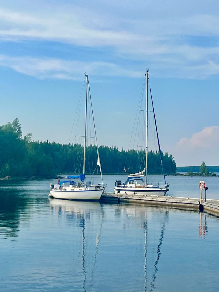 Die Bucht auf der Insel Bergön ist traumhaft schön, es gibt einen Anlegesteg und Infrastruktur, betreut vom Bootsverein Töre (unser Ziel morgen). Man zahlt einen freiwilligen Betrag und kann alles nutzen, vom Klo über Küche bis Sauna.