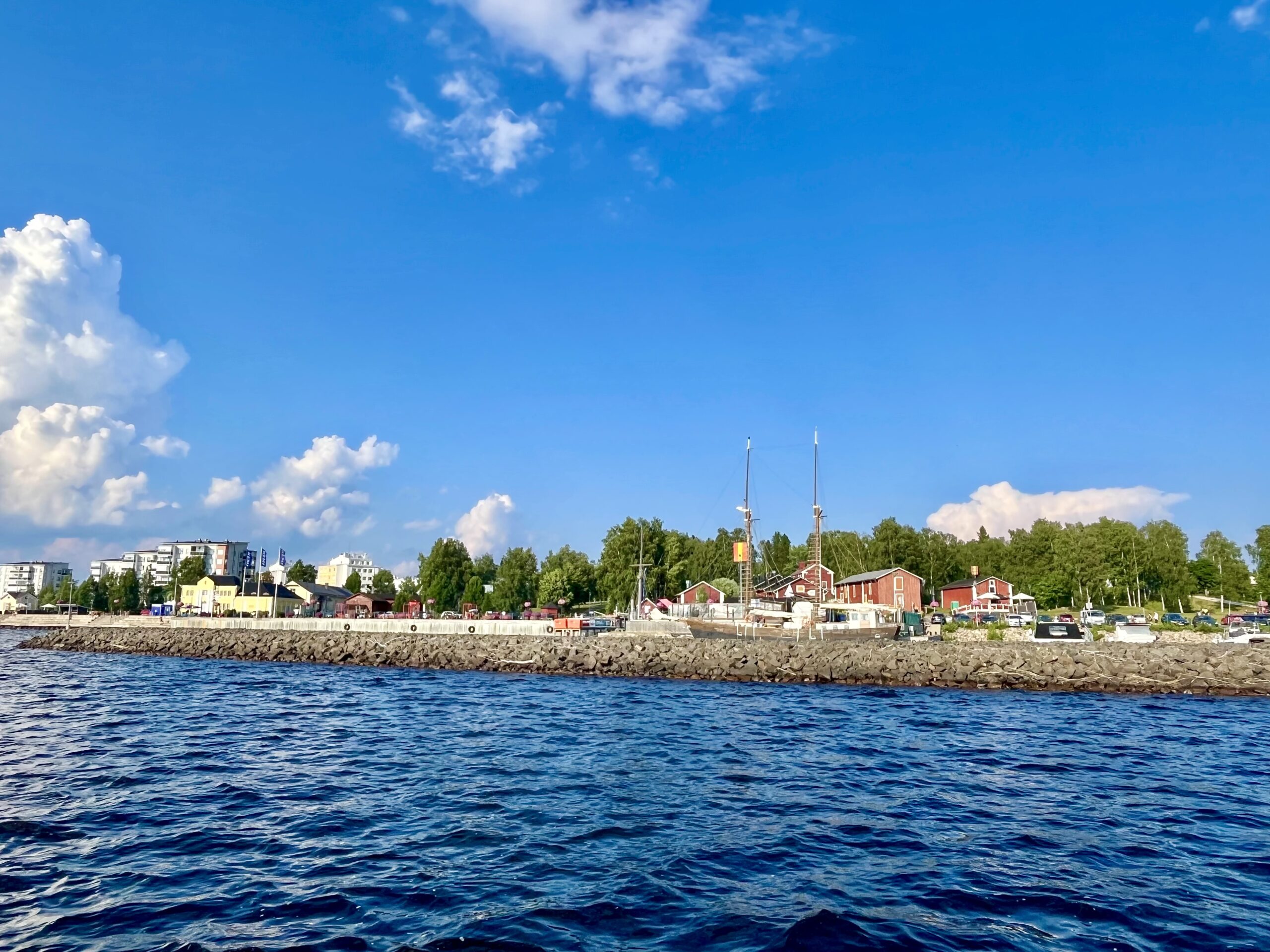 Wir sind gestern lange 48 Seemeilen in 11 Stunden ins finnische Kemi gefahren. Mit wenig Wind, dafür immer noch mit Hitze. Haparanda, ein weiteres Segler-Sehnsuchtsziel, haben wir links liegen gelassen. Den wahren „Nordpol“ der Ostsee hatten wir ja vor zwei Tagen an der gelben Tonne, das reicht uns. Zum Abschied aus Schweden schaute noch eine kleine Ringelrobbe zu uns rüber.