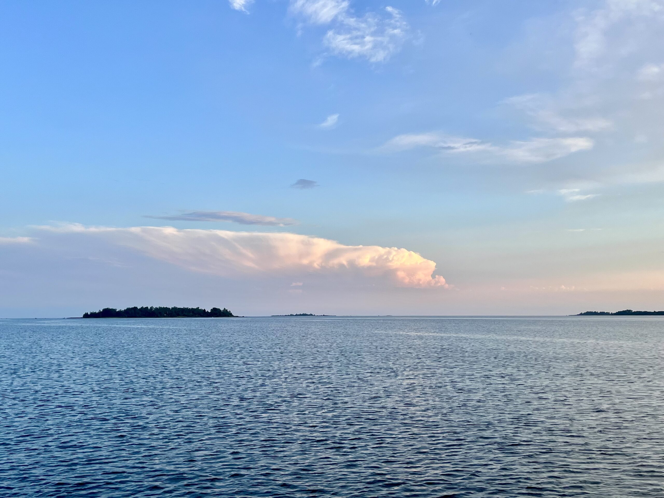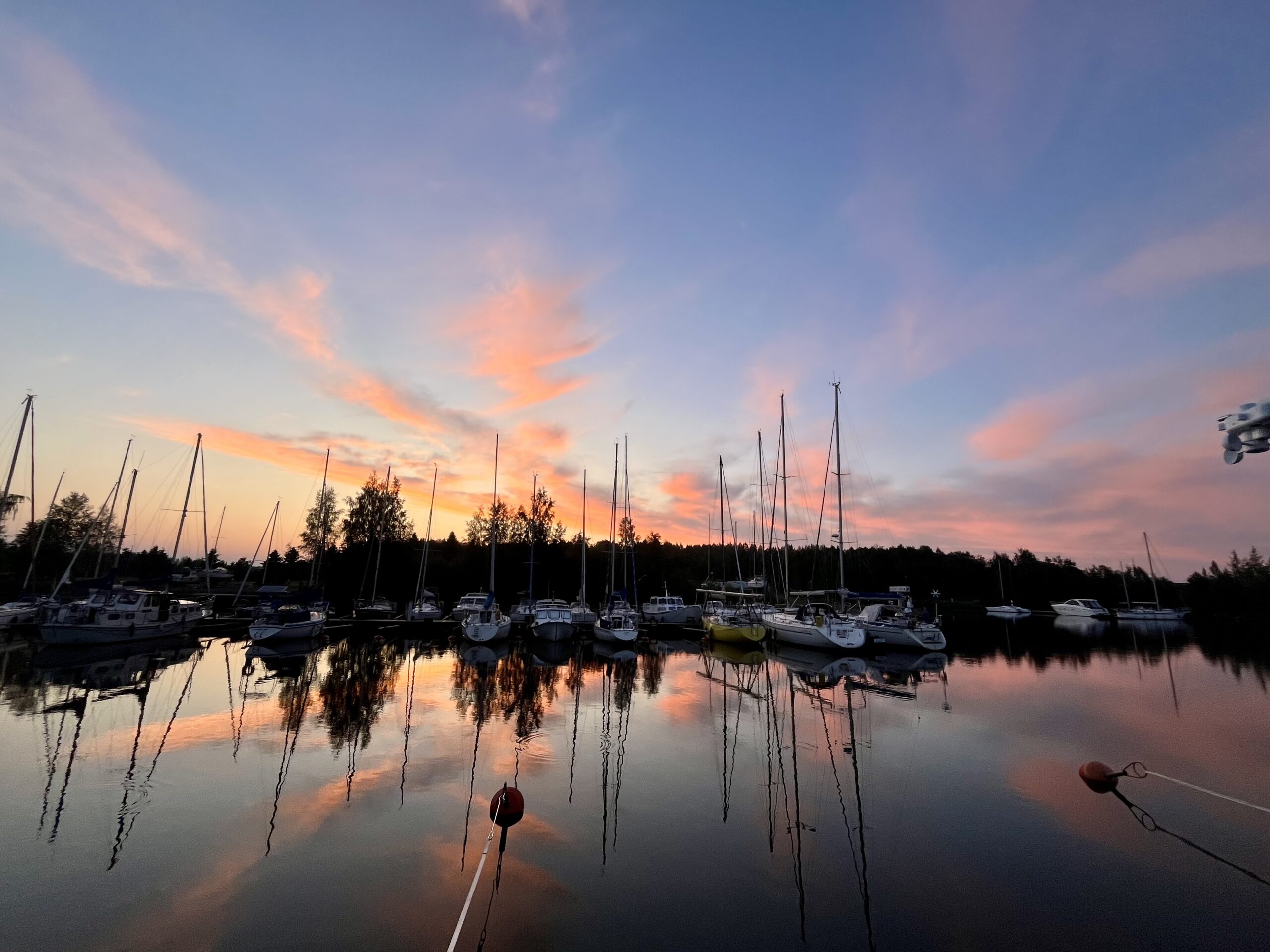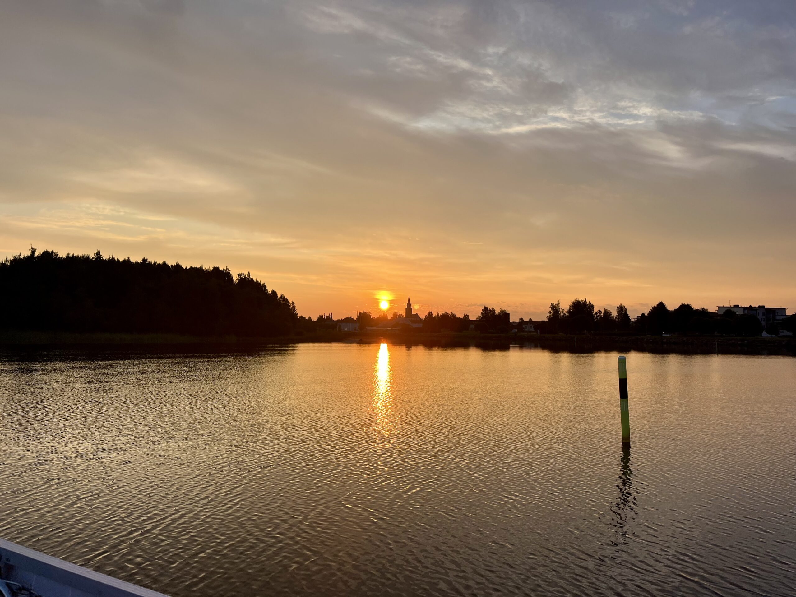 Letzte Nacht war sehr kurz. Erst das heftige Gewitter um Mitternacht, dann hat der Wecker um 4 Uhr geklingelt. Wir hatten eine Strecke mit möglicherweise zwei Etappen von ca. 35 und 15 Seemeilen vor uns und wollten nicht in den unbeständigen, mit Gewitterpotenzial aufgeladenen Spätnachmittag hineinsegeln. Frühes Aufstehen hat den Vorteil, dass man mal einen Sonnenaufgang mitkriegt. Es gibt hier auch nicht mehr diese Fülle an Übernachtungsmöglichkeiten für Segler wie in Schweden, daher ist vorausschauende Planung mit Alternativen notwendig.