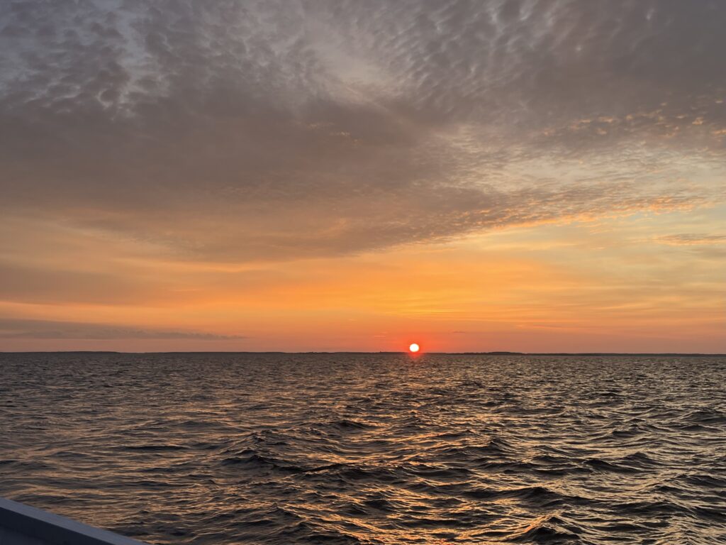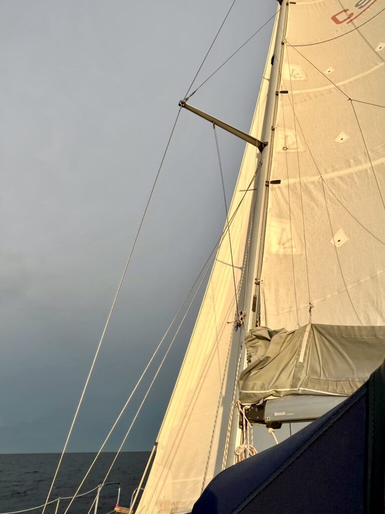 Unsere Planänderung hat funktioniert. Das frühe Aufstehen war zwar unangenehm, hat uns aber zum zweiten Mal einen zauberhaften Sonnenaufgang beschert. Als Bonus obendrauf gab es guten Segelwind, sodass wir gut vorankamen und die 45 Seemeilen in 9 Stunden geschafft haben. Die vielen Steine und die zum Teil enge Betonnung forderten dem Skipper wieder viel Konzentration ab. Unterwegs wurde dann der Himmel wie vorausgesagt immer grauer und die verwaschene Umgebung fühlte sich teilweise recht mystisch an. Teilweise war die Grenze zwischen Wasser und Himmel nicht mehr auszumachen. Wir bekamen natürlich auch einige kräftige Duschen ab, inklusive längst notwendig gewordene Bootswäsche für die Salida. Die angekündigte Gewitterfront zog aber an uns vorbei, ohne uns zu treffen. Wir waren nicht böse darüber.