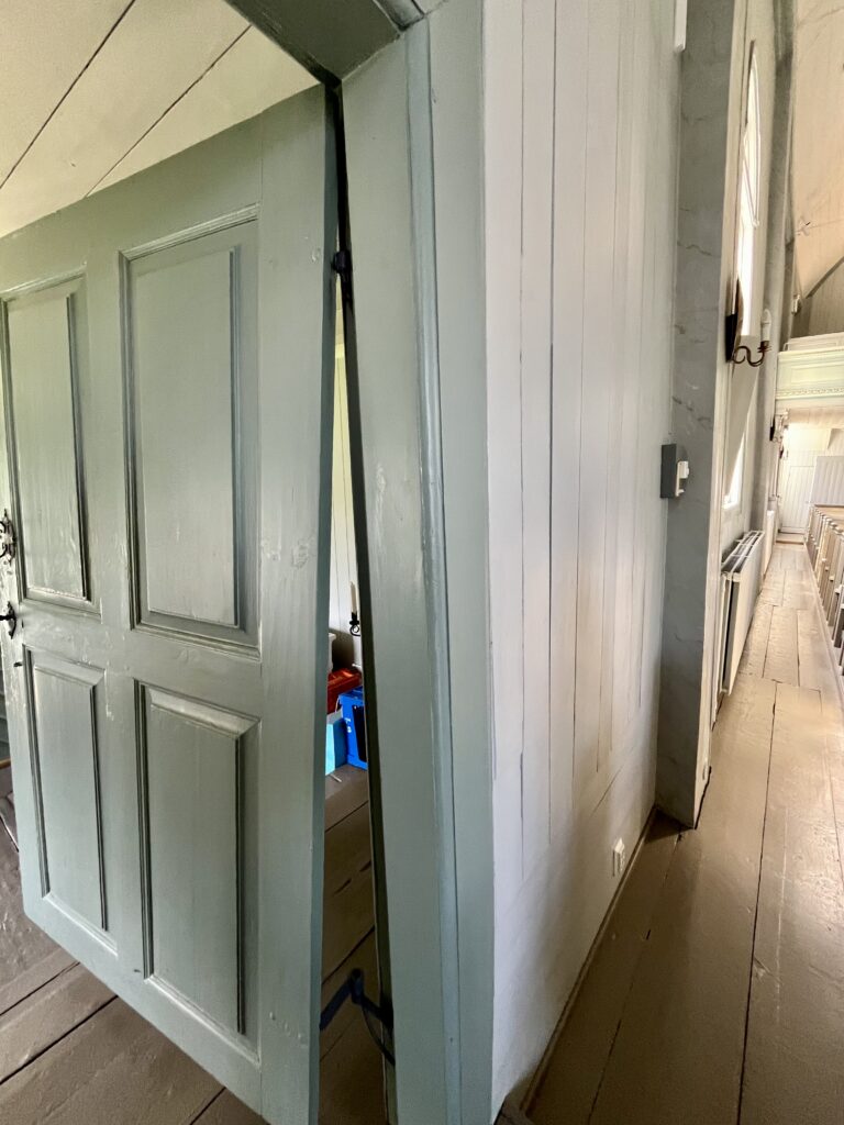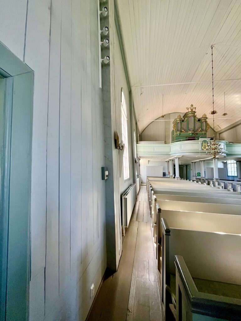 Wir holten erst ein bisschen Schlaf nach und fuhren dann mit den im Hafen frei verfügbaren Fahrrädern los, um den drei Kilometer entfernten, kleinen Ort zu erkunden. Supermarkt und Kirche waren schnell gefunden, viel mehr war auch nicht vorhanden. An der Kirche hatten wir Glück, denn bei unserem Eintreffen kam gerade ein Mann heraus und wollte schon abschließen. Auf meine Frage, ob wir kurz in die Kirche hineinsehen dürften, gestand er uns zwei bis drei Minuten zu 🤭. Länger brauchte man auch nicht für die kleine Kirche. Ich wunderte mich nur, wieso er mich aufforderte, mit ihm ans Ende des Ganges zu gehen, dann würde ich alles sehen. Ok, dachte ich, wenn er meint … aber dann sah ich es tatsächlich: Die Kirche war schief 😱, eine Seite hatte sich abgesenkt. Hätte ich vielleicht sonst nicht bemerkt. Alles in allem ein schönes Erlebnis.