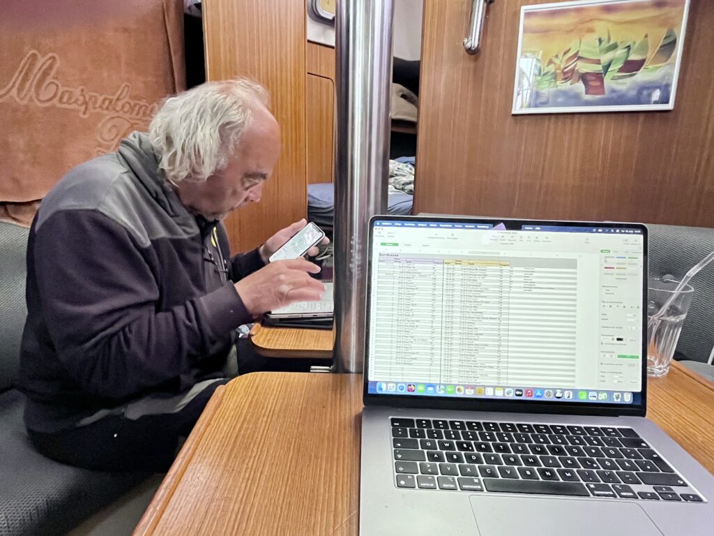 Den „Bootsarrest“ haben wir dann für längst überfällige Büroarbeiten genutzt: Walter hat die Route auf der Karte nachgetragen und ich hab die Bootskasse aktualisiert. Und es war mal Zeit, etwas aufwändiger zu kochen 🧑🍳. Schon in der Nacht zu Sonntag ließen Sturm und Regen nach und wir konnten wieder etwas besser schlafen. Aber es hat sich merklich abgekühlt, wir müssen wieder Pullover und dicke Socken anziehen.