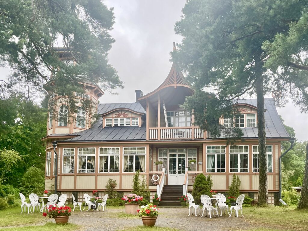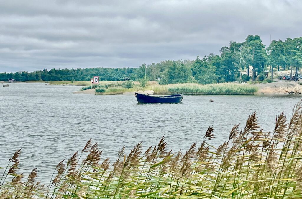 Das Hinweisschild zur Villa Tallbo war mir schon vor ein paar Tagen ins Auge gestochen. Im Internet hatte ich gelesen, dass es am Wochenende ein Buffett geben soll – das wollte ich gerne ausprobieren. Nach dem Motto „All you can eat“ konnte man sich dann auch am großen Buffett-Tisch bedienen. Die Auswahl an Fisch- und Fleischgerichten war gut; die fünf verschiedenen Arten eingelegter Hering (ich) sowie der geräucherte und der gegrillte Lachs (Walter) waren für uns die Highlights. Drumherum jede Menge Salate, Aufläufe etc. So pappsatt war ich schon lange nicht mehr. Gut, dass wir noch ein paar Meter zu Fuß zum Boot zurückzulegen hatten.