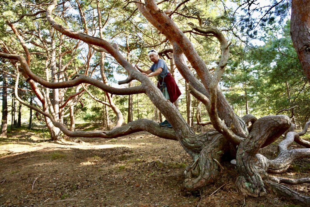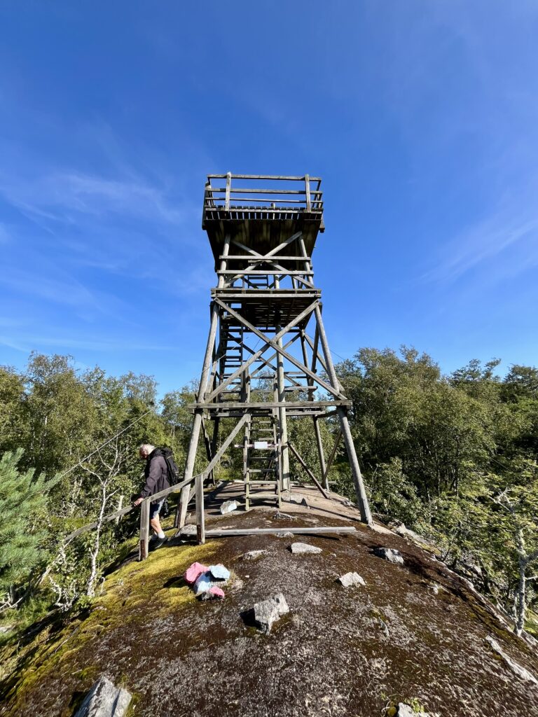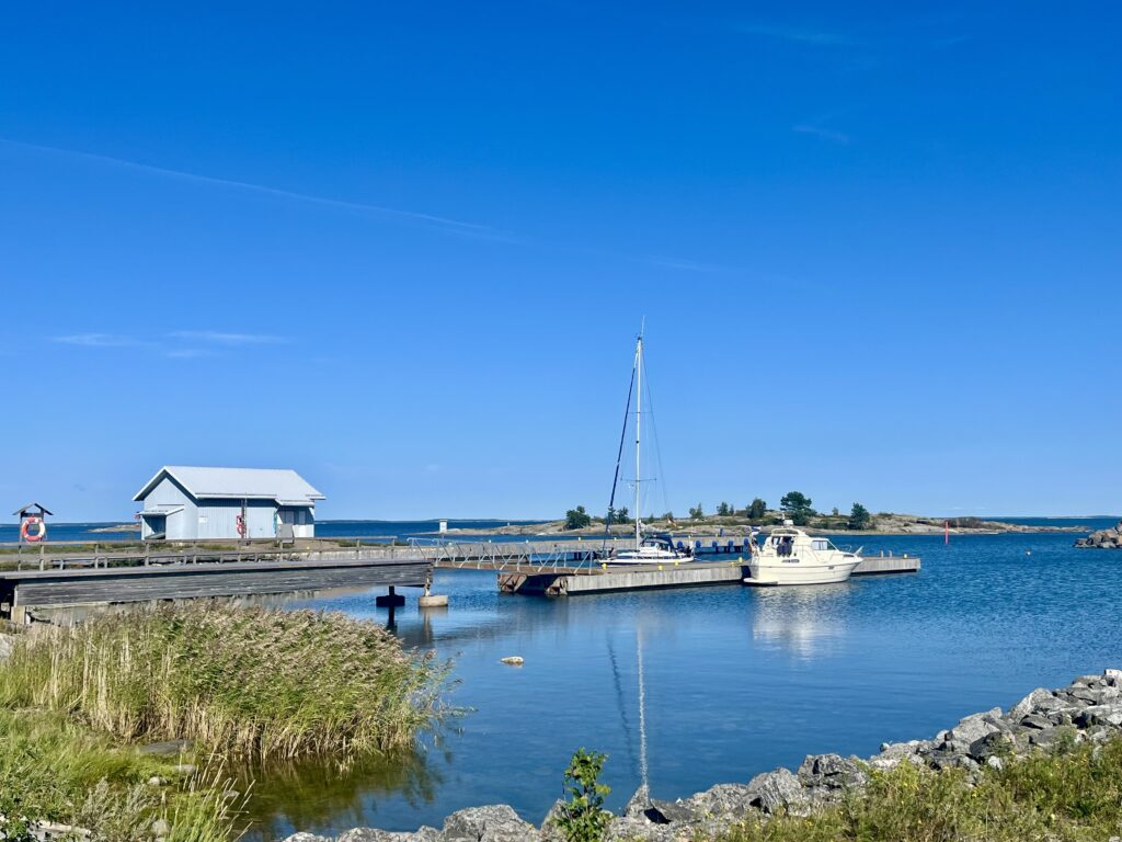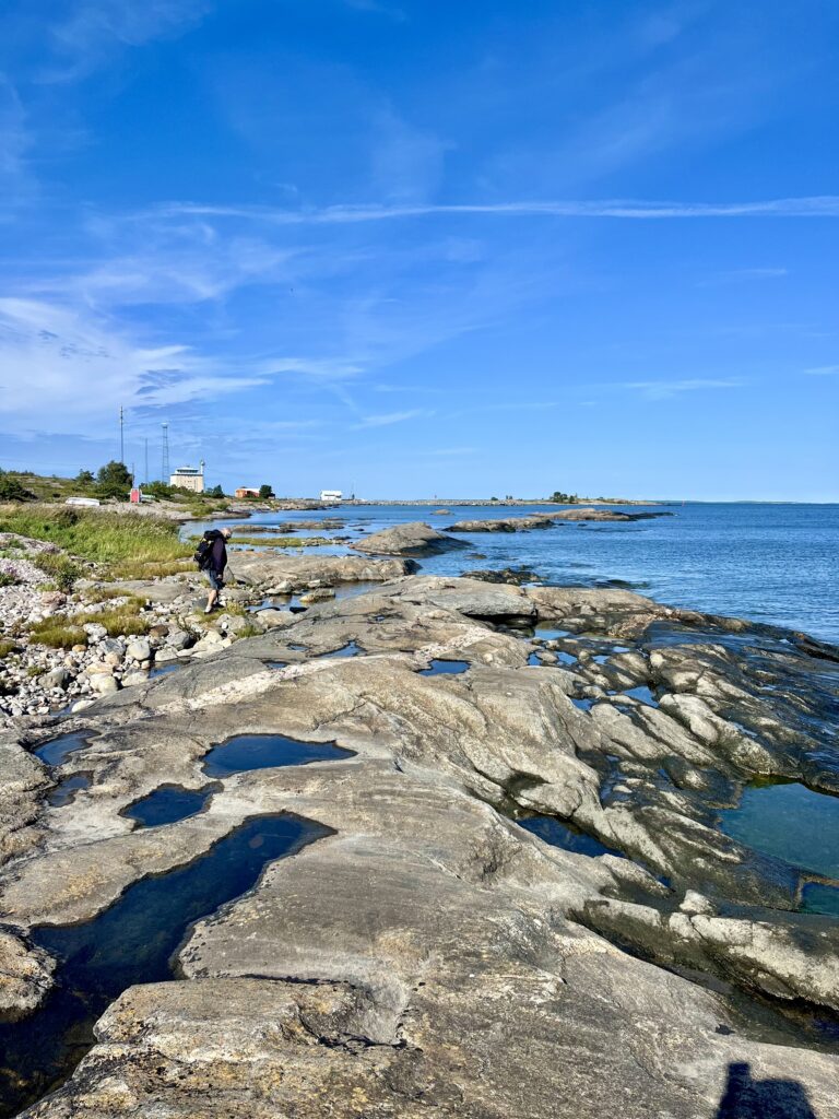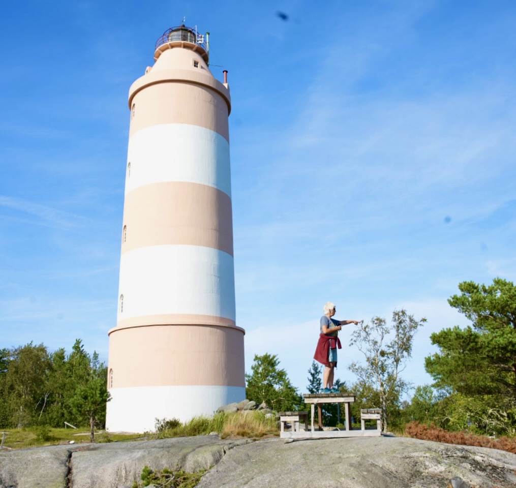 Die Insel Isokari ist eine kleine Ausflugsinsel und eine Fähre bringt ein Dutzend Tagesgäste hierher. Es gibt einen Kiosk mit sauteuren Souvenirs, einen schönen rot-weiß-gestreiften Leuchtturm, einige Ferienhäuser, alte Militäranlagen und einen Rundwanderweg. Da wir früh genug da waren, hatten wir genug Zeit, den Weg zu laufen. Die Insel ist im Norden steinig und an der Westküste felsig, aber im Inneren gibt es Wald und kleine Seen. Viele Infotafeln am Wegesrand weisen auf Besonderheiten hin. Leider nicht auf die Kreuzotter, die Walter beim Sonnen auf den Felsen gestört hat. Sie war zwar schnell im Dickicht verschwunden, aber genauso schnell war ich auf dem Tisch 😱.