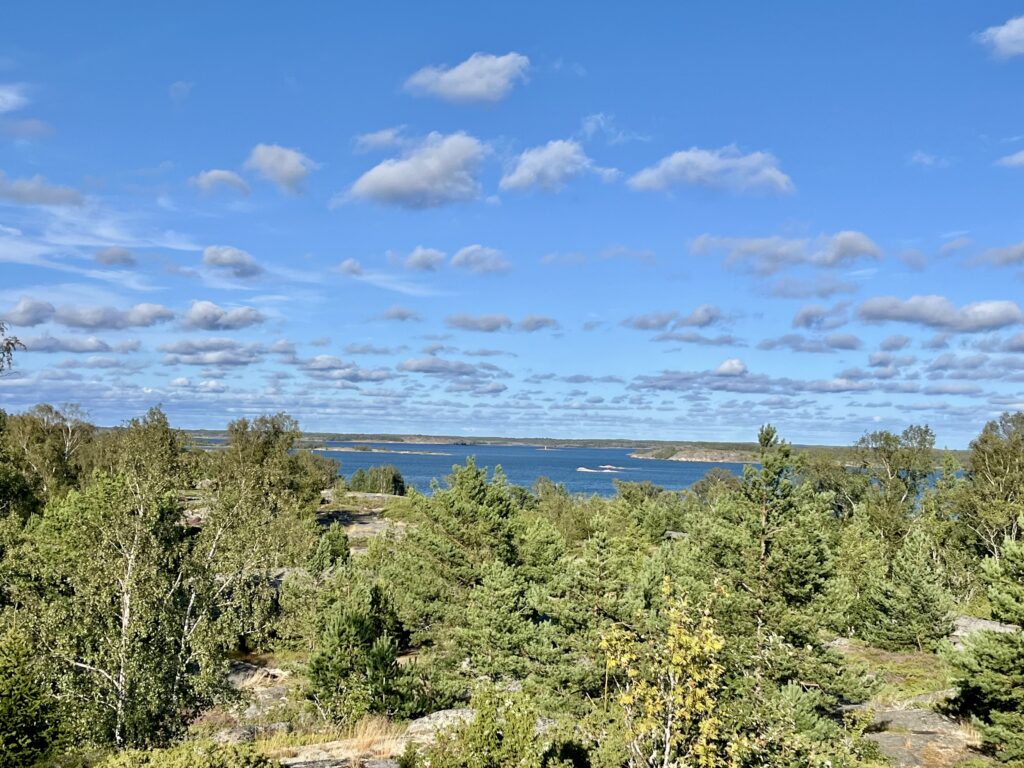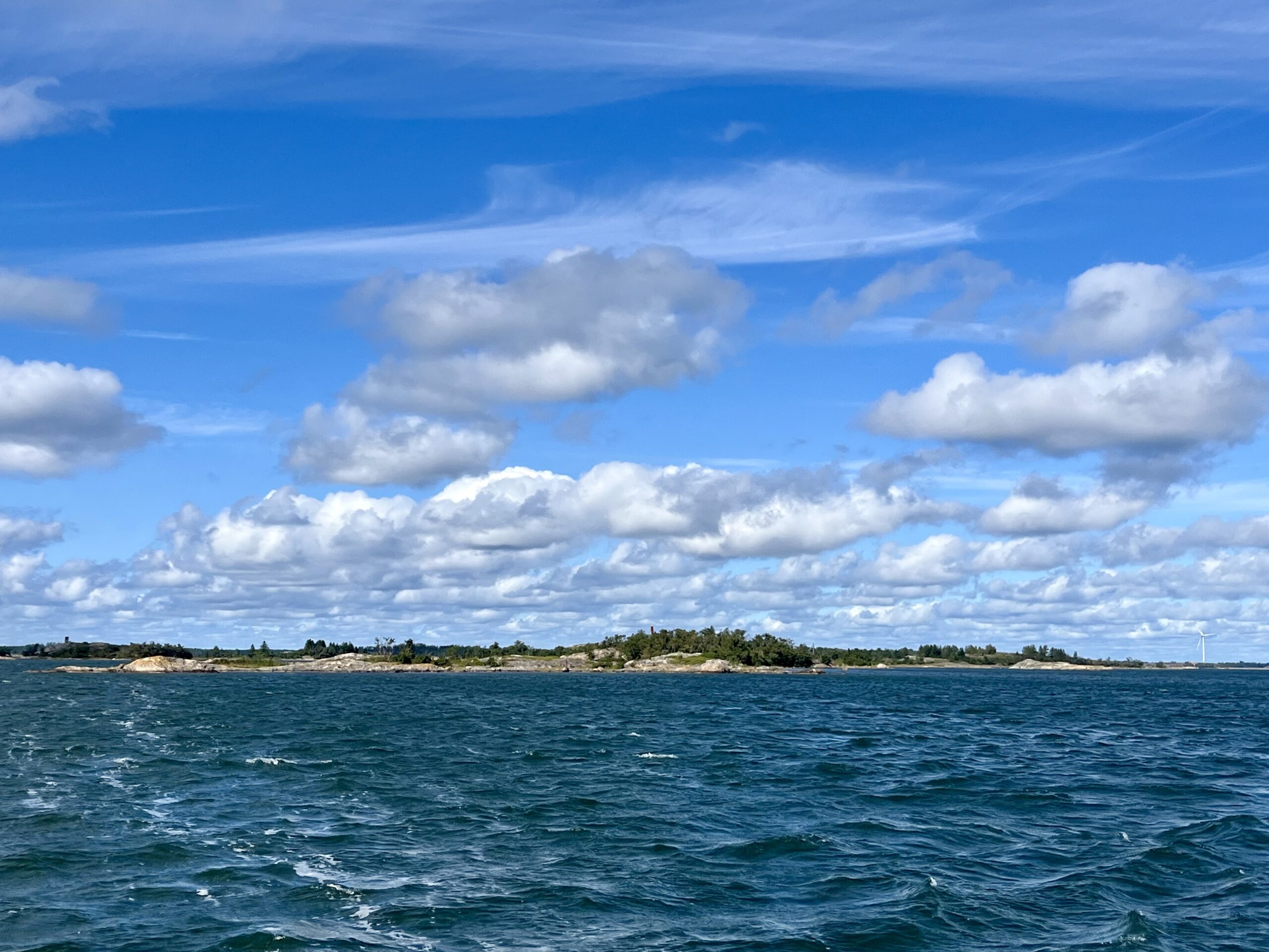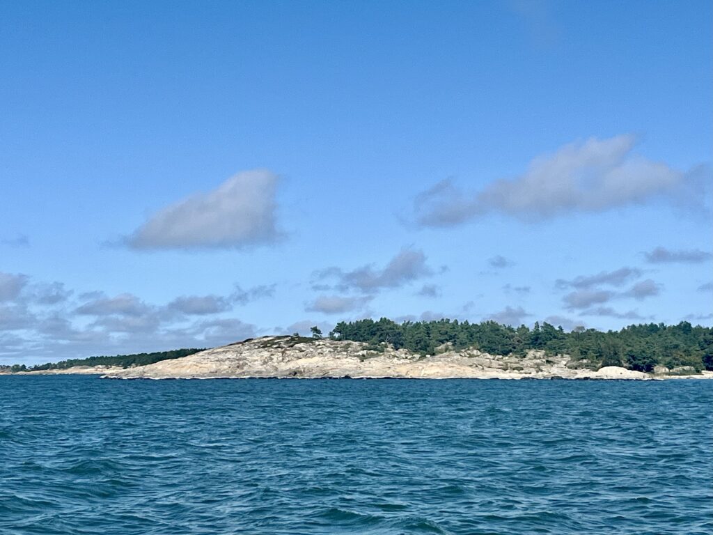 Mit dem frischen Nordwind kamen wir nur mit der Genua recht flott von der Insel weg. Später, weiter draußen, wurden die Wellen dann recht hoch, aber die Windrichtung stimmte und so pfiff die Salida mit 6 bis 7 Knoten über sie hinweg. Es war seit langem mal wieder sportliches Segeln möglich, aber für Walter natürlich auch viel Arbeit am Steuer. Schon bald hatten wir die ersten Inselchen des Åland-Archipels erreicht. Heute ließ sich sehr gut die Veränderung der Wasserfarbe mit der Zunahme der Wassertiefe beobachten.
