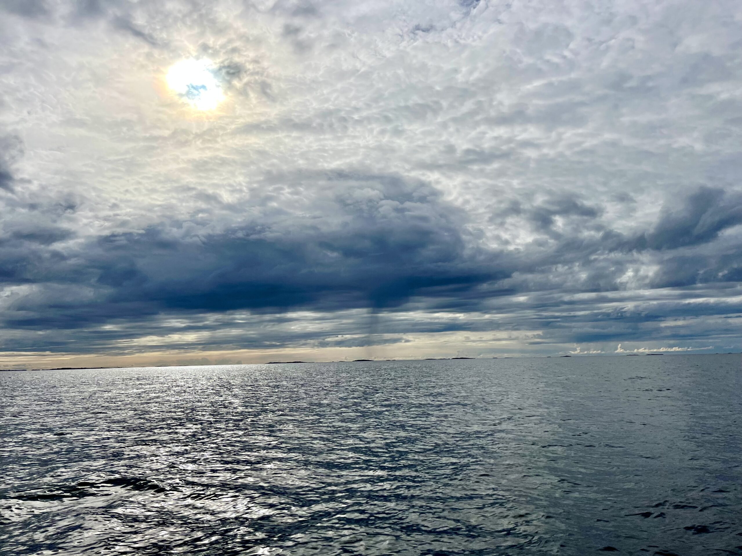 Unsere Überfahrt nach Schweden drohte langweilig zu werden, ringsherum stundenlang nur Wasser. War aber nicht so. Der Himmel überraschte mit immer interessanteren Wolkenformationen, von denen man nicht wusste, wann und wo sie ihre gespeicherte Feuchtigkeit abgeben würden. Der Wind trieb auch seine Spielchen mit uns – mal genug zum Segeln, dann wieder nicht, mal stimmte die Richtung, mal nicht. Es war ein Hin und Her.