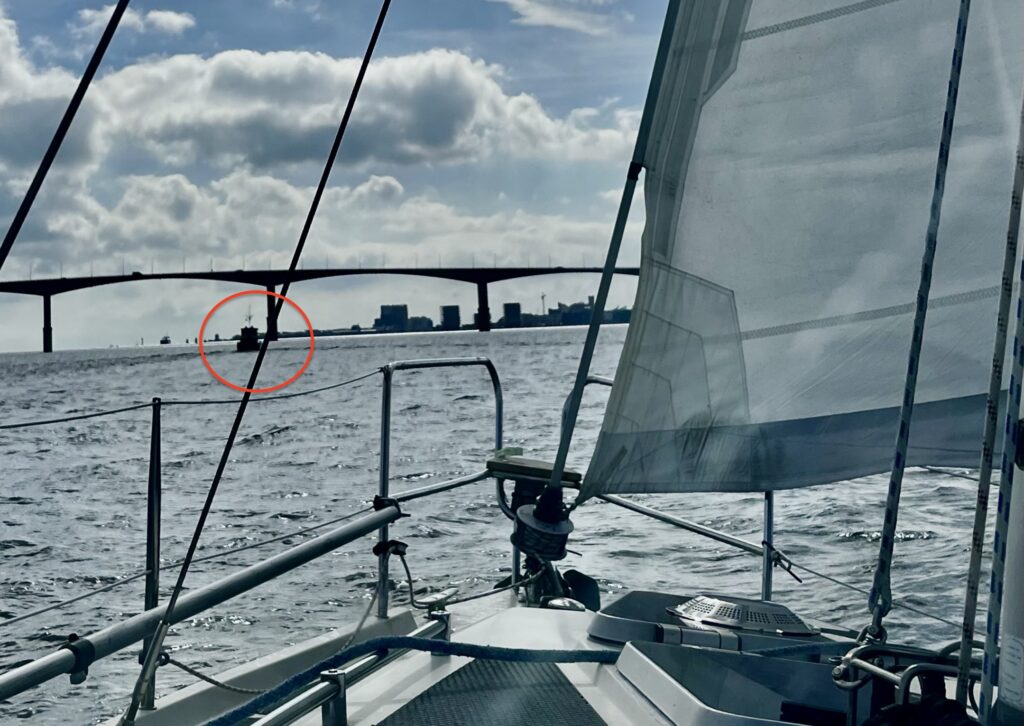 Und dann mit Genua und Groß durch die Ölandbrücke und das dritte „ups“. Was kommt uns denn da für ein dickes Seezeichen entgegen? Es entpuppte sich dann als fetter Frachter von vorn. Wir sahen zunächst nur den Bug und die Antennen.